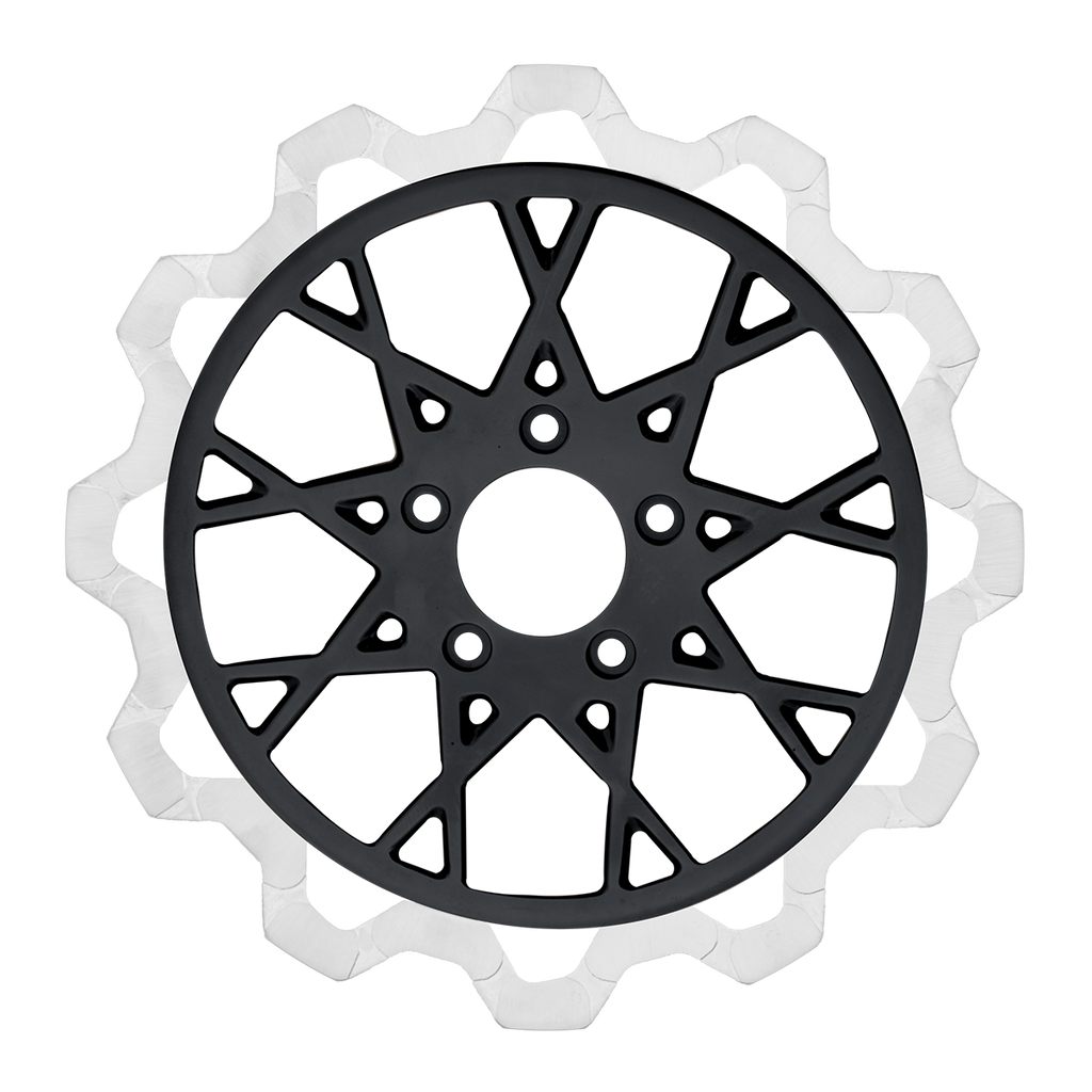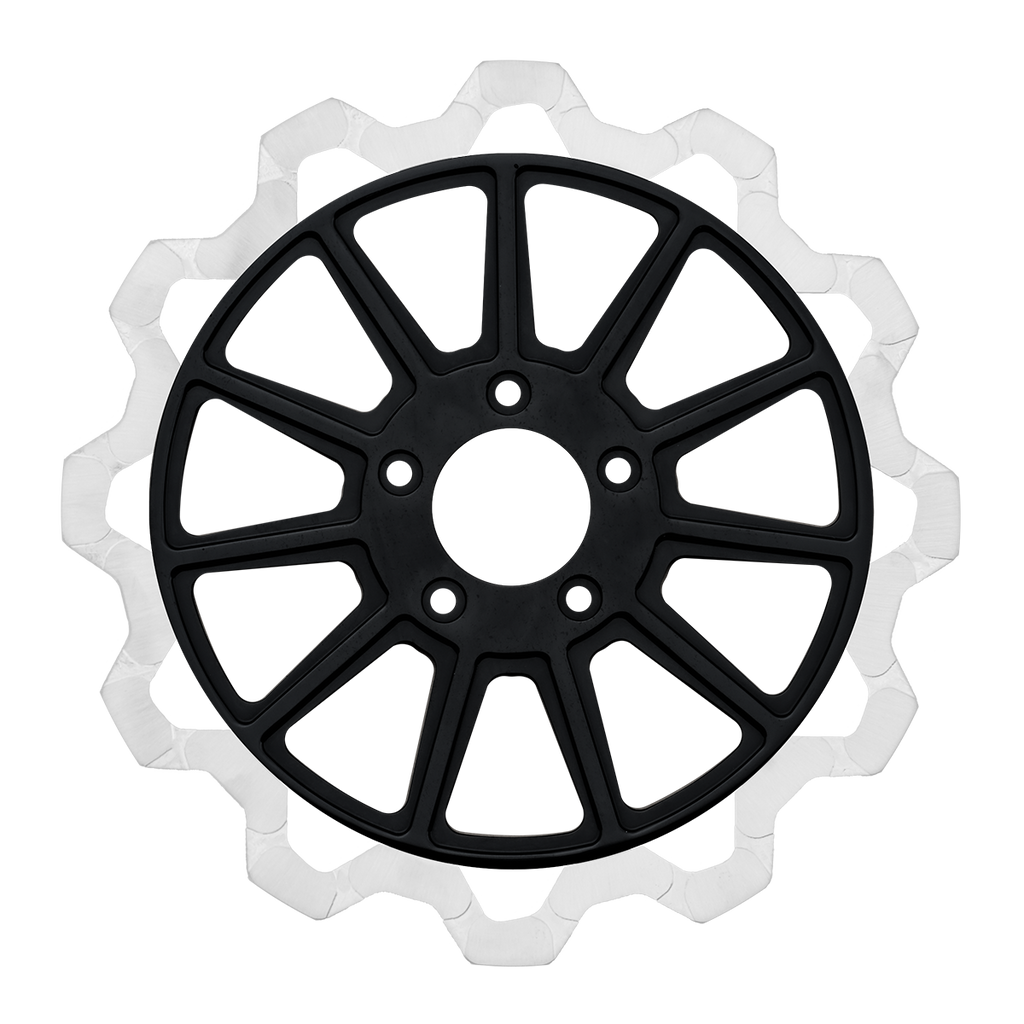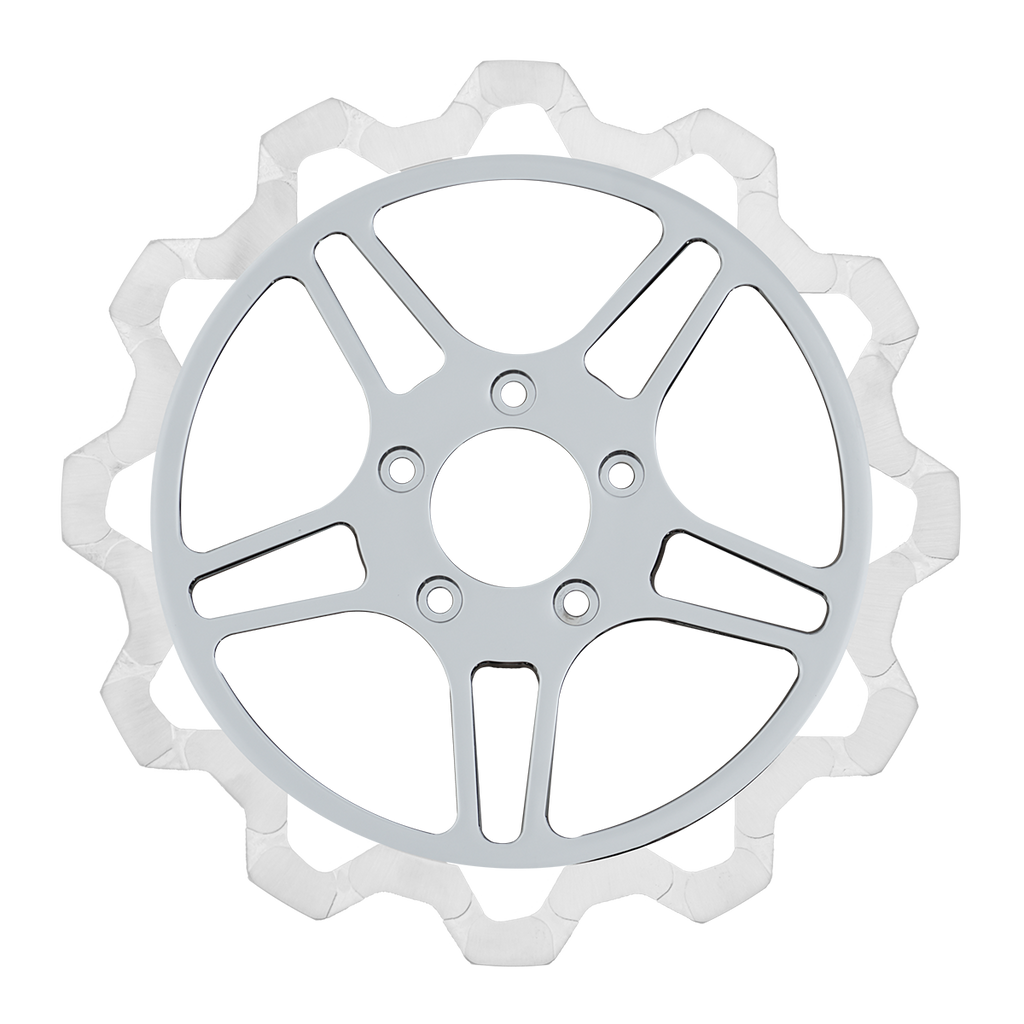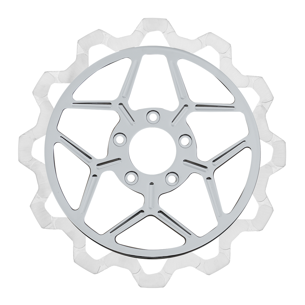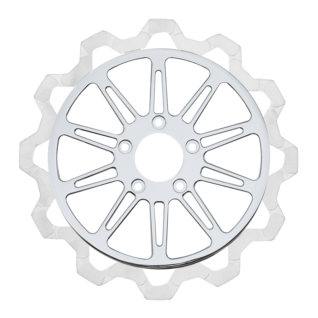 The reduced weight of Lyndall Crown cut rotors enhances rider control by minimizing rotating mass, while the incorporated gas slots effectively outgas debris and gasses generated during friction, preserving the rotor's integrity against brake pad wear and aiding in cooling.