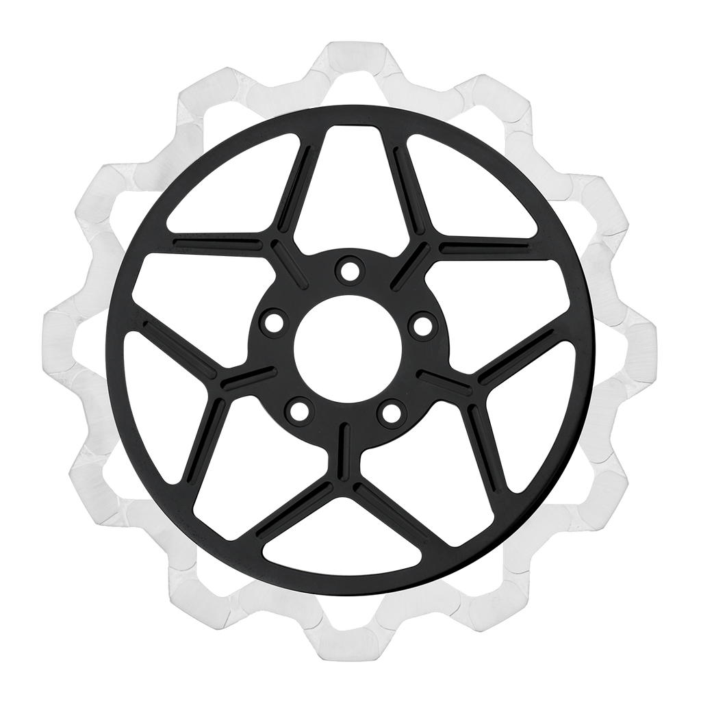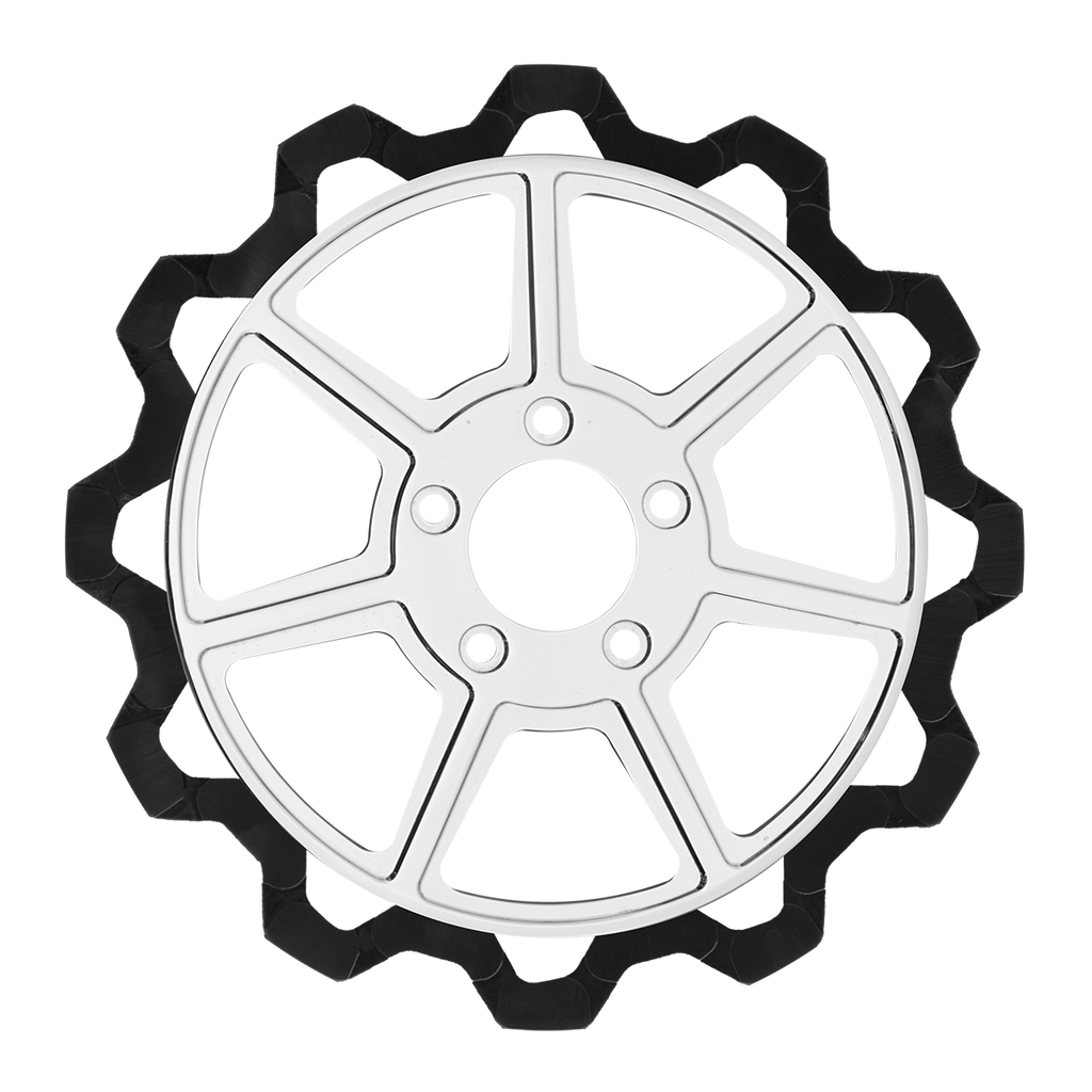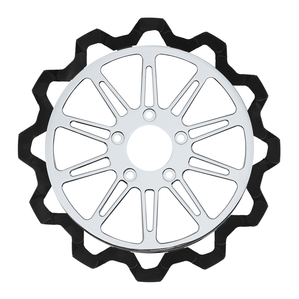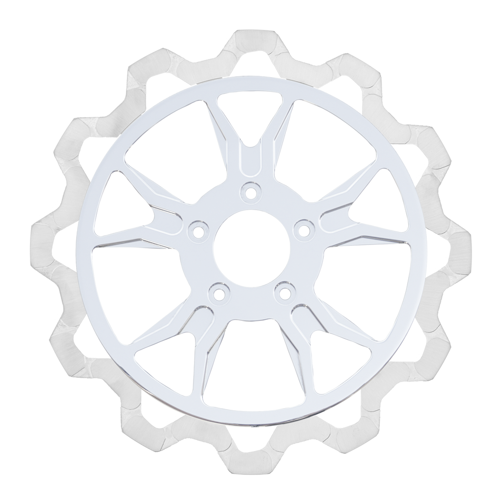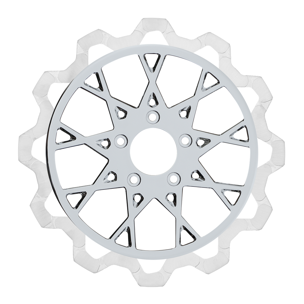 The reduced weight of Lyndall Crown cut rotors enhances rider control by minimizing rotating mass, while the incorporated gas slots effectively outgas debris and gasses generated during friction, preserving the rotor's integrity against brake pad wear and aiding in cooling.