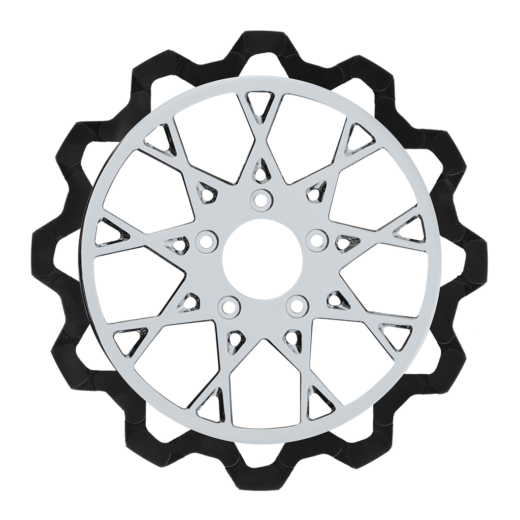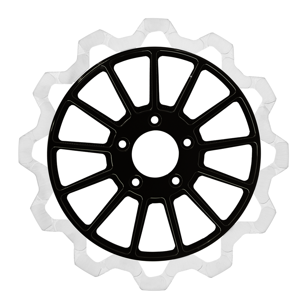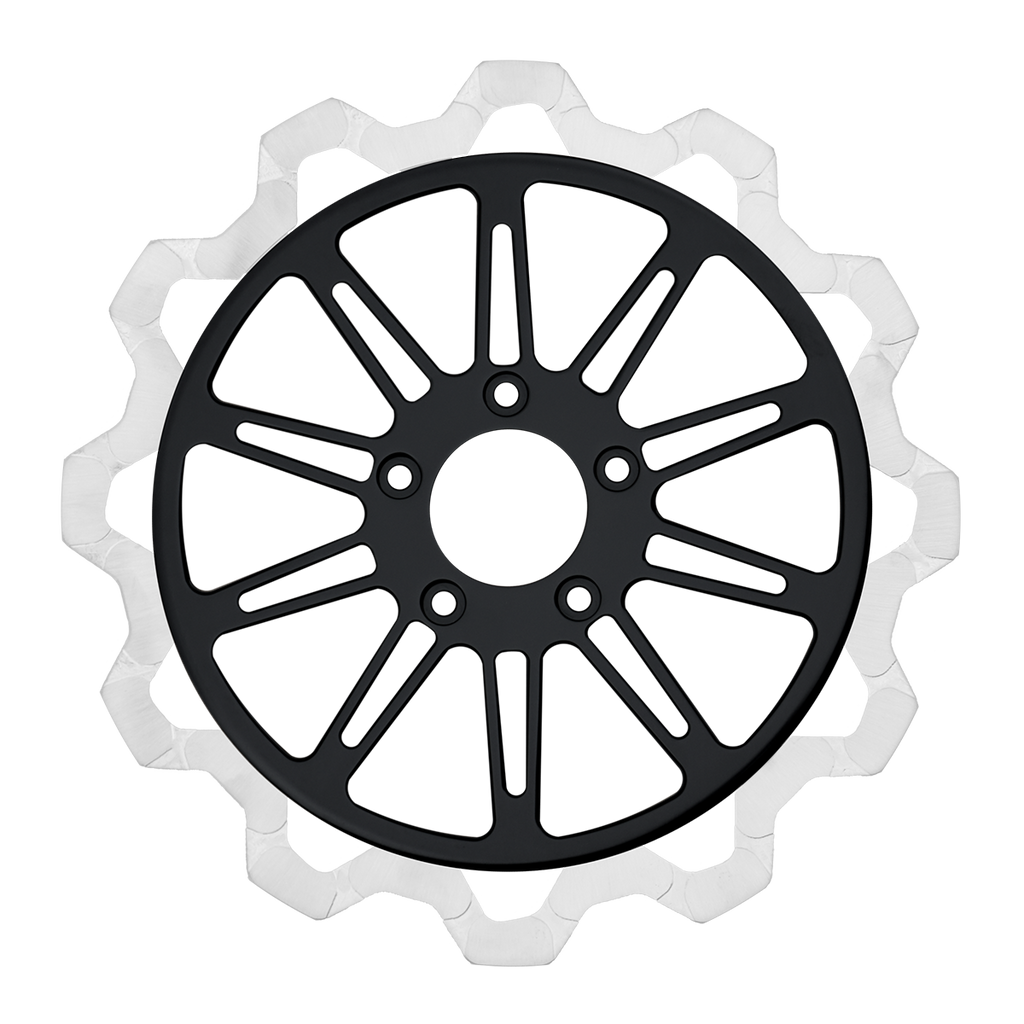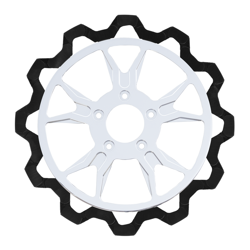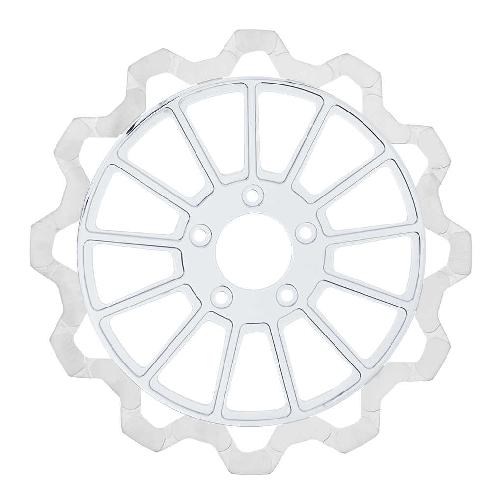The reduced weight of Lyndall Crown cut rotors enhances rider control by minimizing rotating mass, while the incorporated gas slots effectively outgas debris and gasses generated during friction, preserving the rotor's integrity against brake pad wear and aiding in cooling.