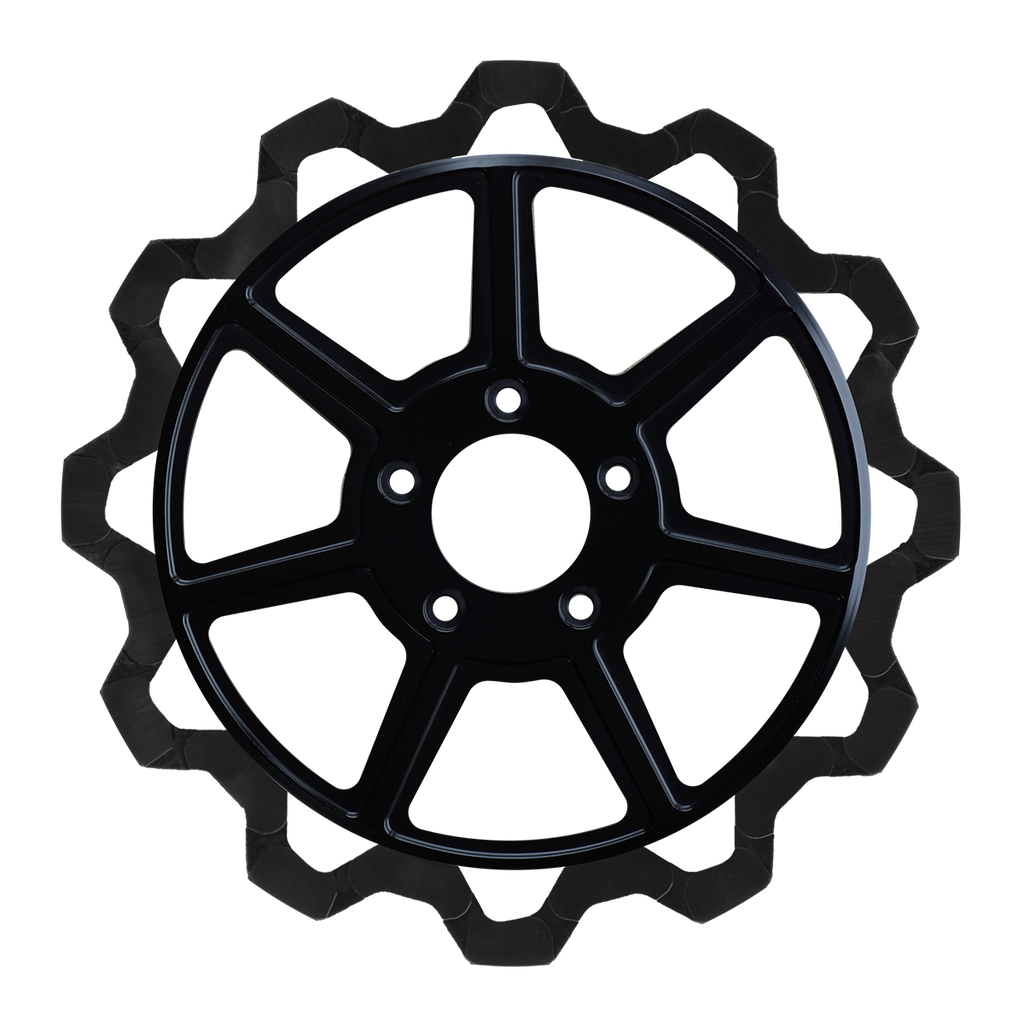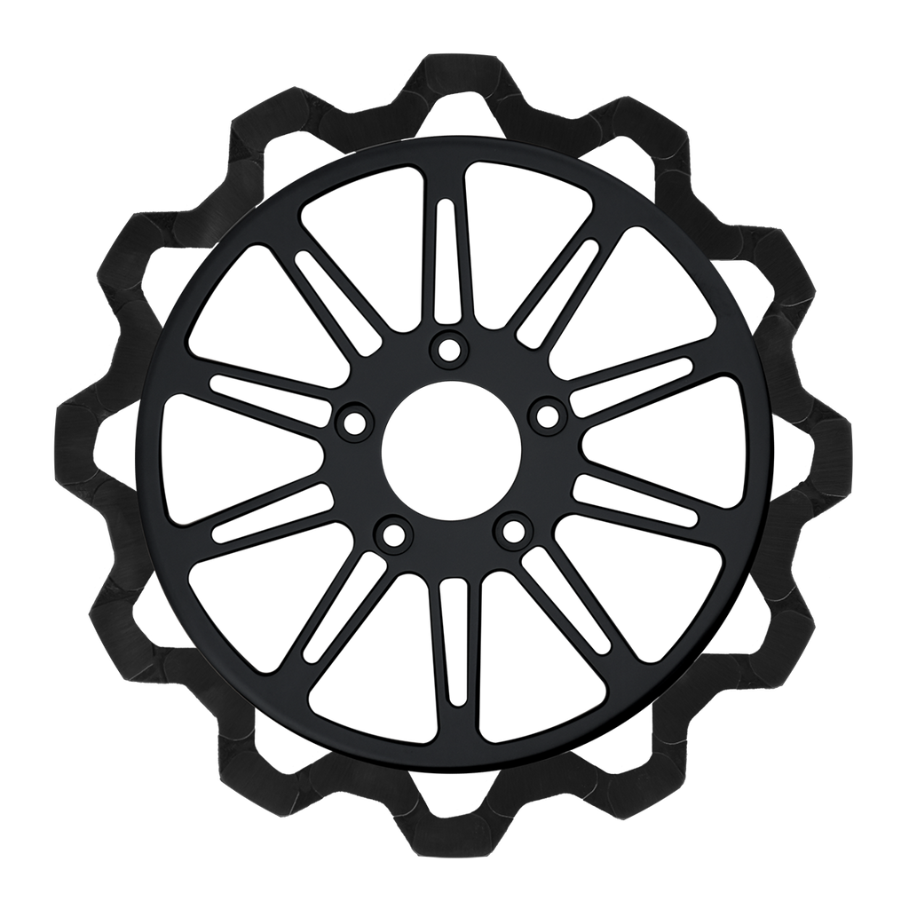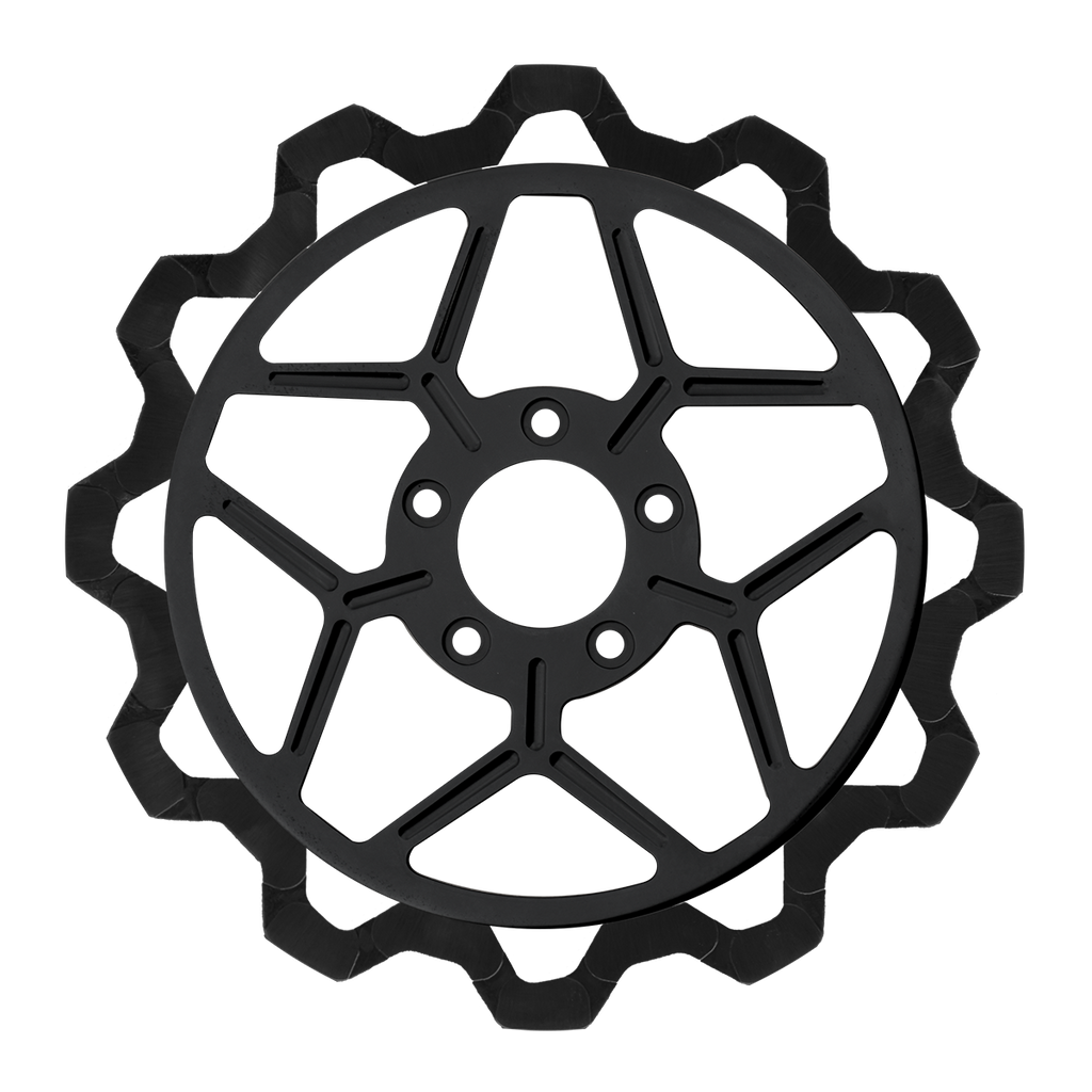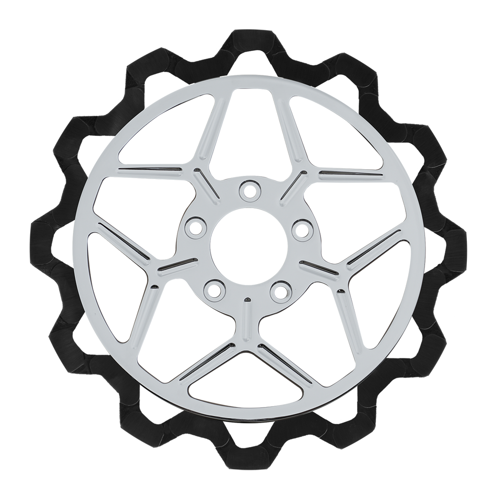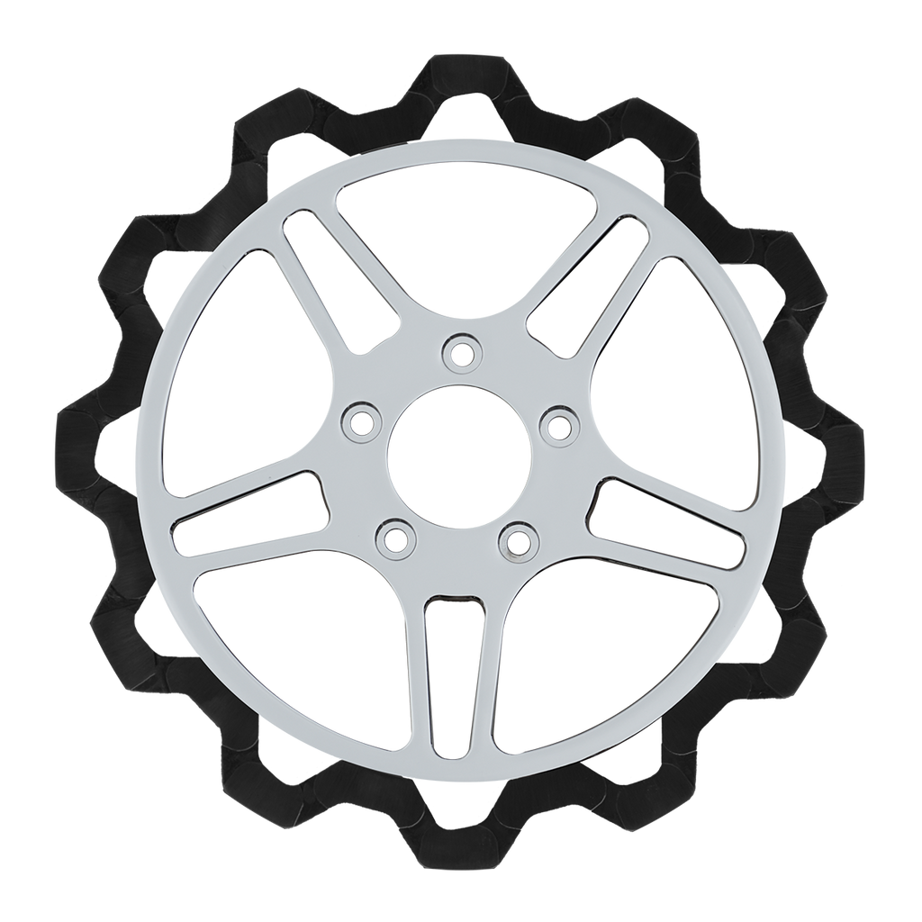 The reduced weight of Lyndall Crown cut rotors enhances rider control by minimizing rotating mass, while the incorporated gas slots effectively outgas debris and gasses generated during friction, preserving the rotor's integrity against brake pad wear and aiding in cooling.