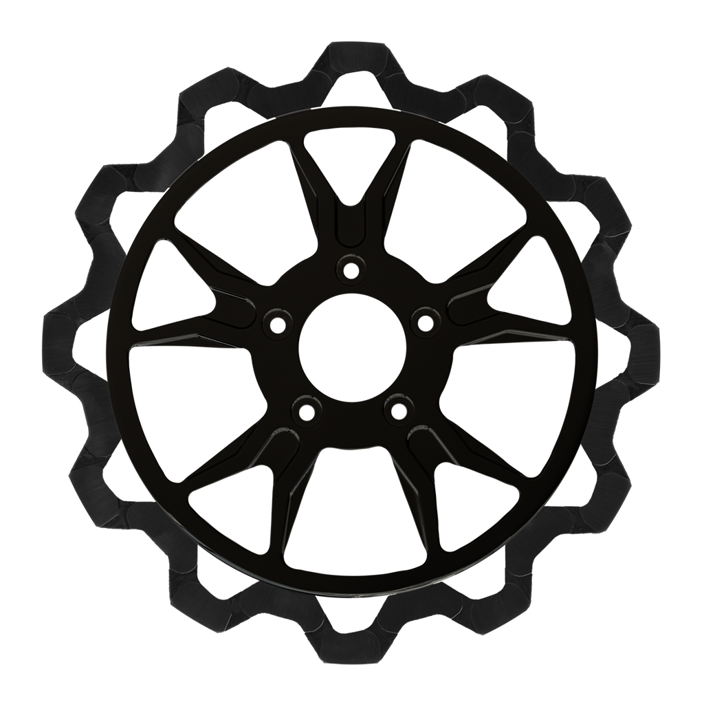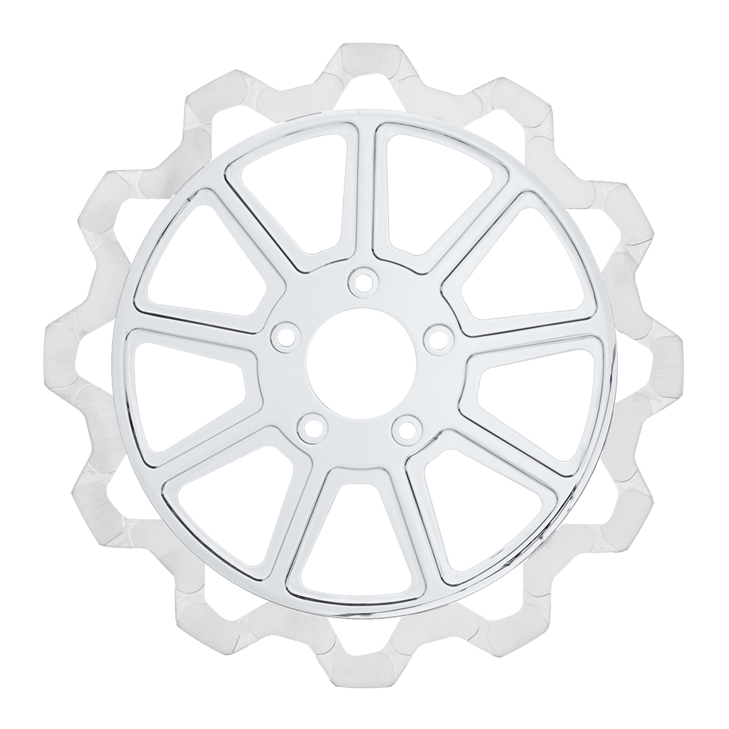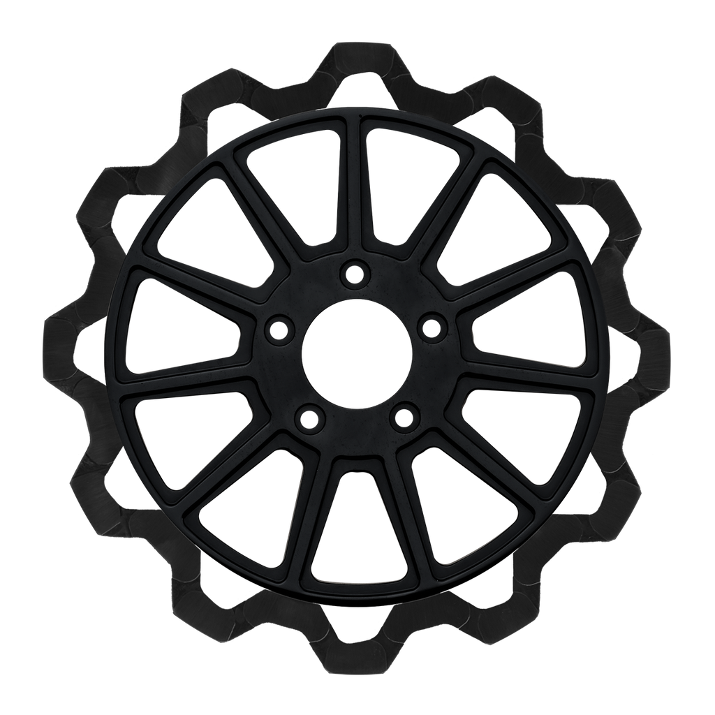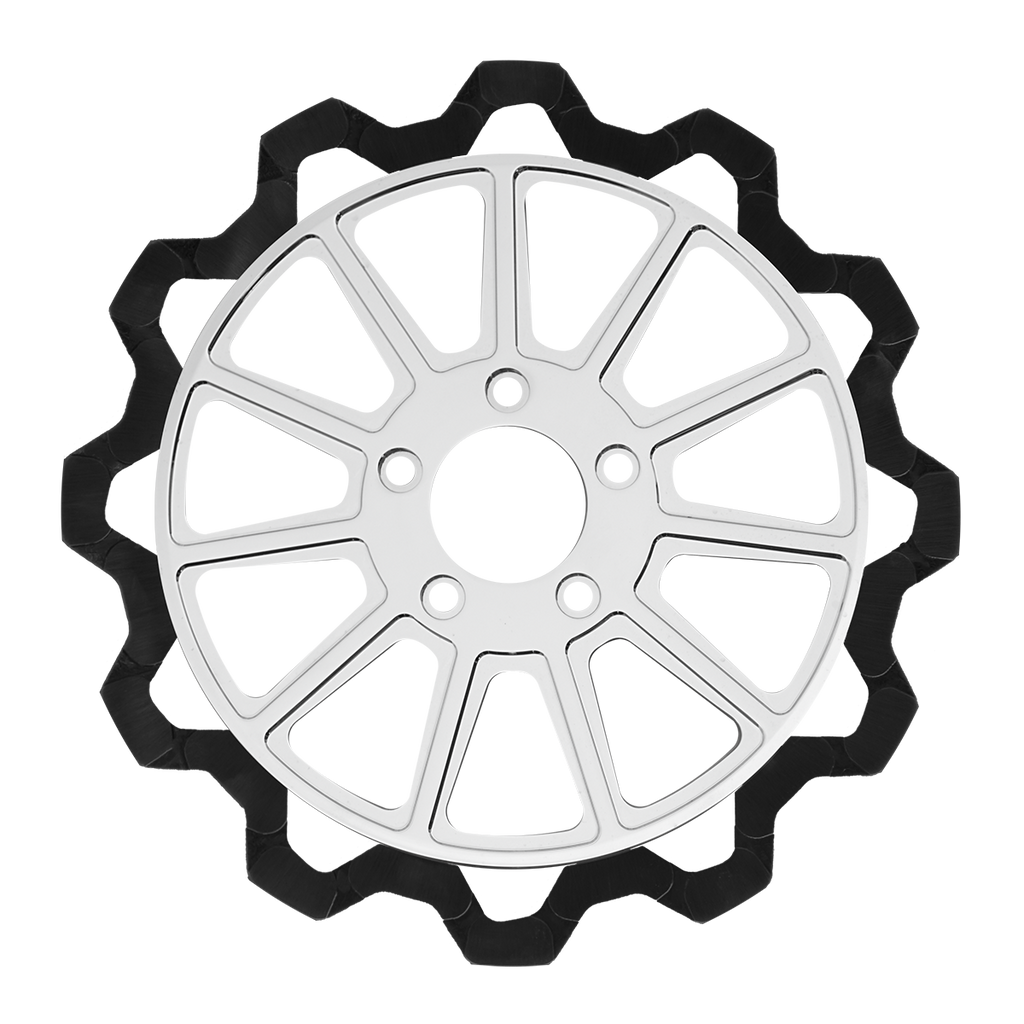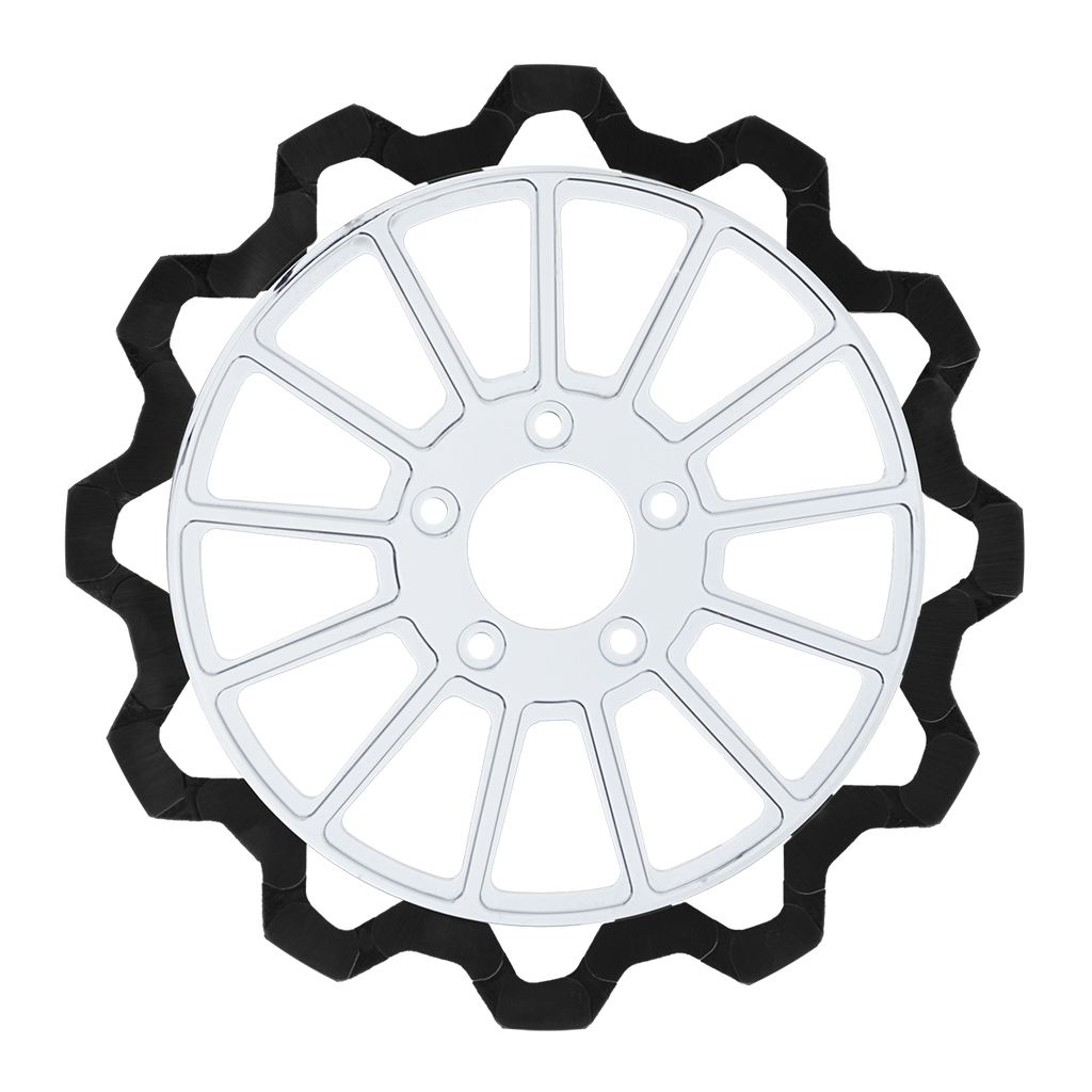 The reduced weight of Lyndall Crown cut rotors enhances rider control by minimizing rotating mass, while the incorporated gas slots effectively outgas debris and gasses generated during friction, preserving the rotor's integrity against brake pad wear and aiding in cooling.
