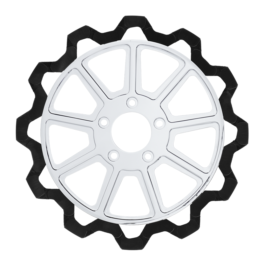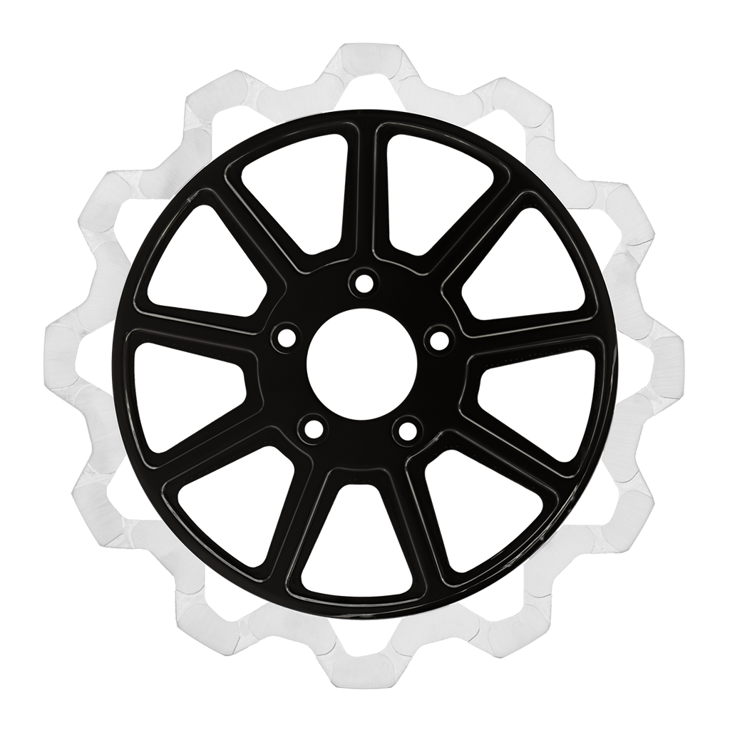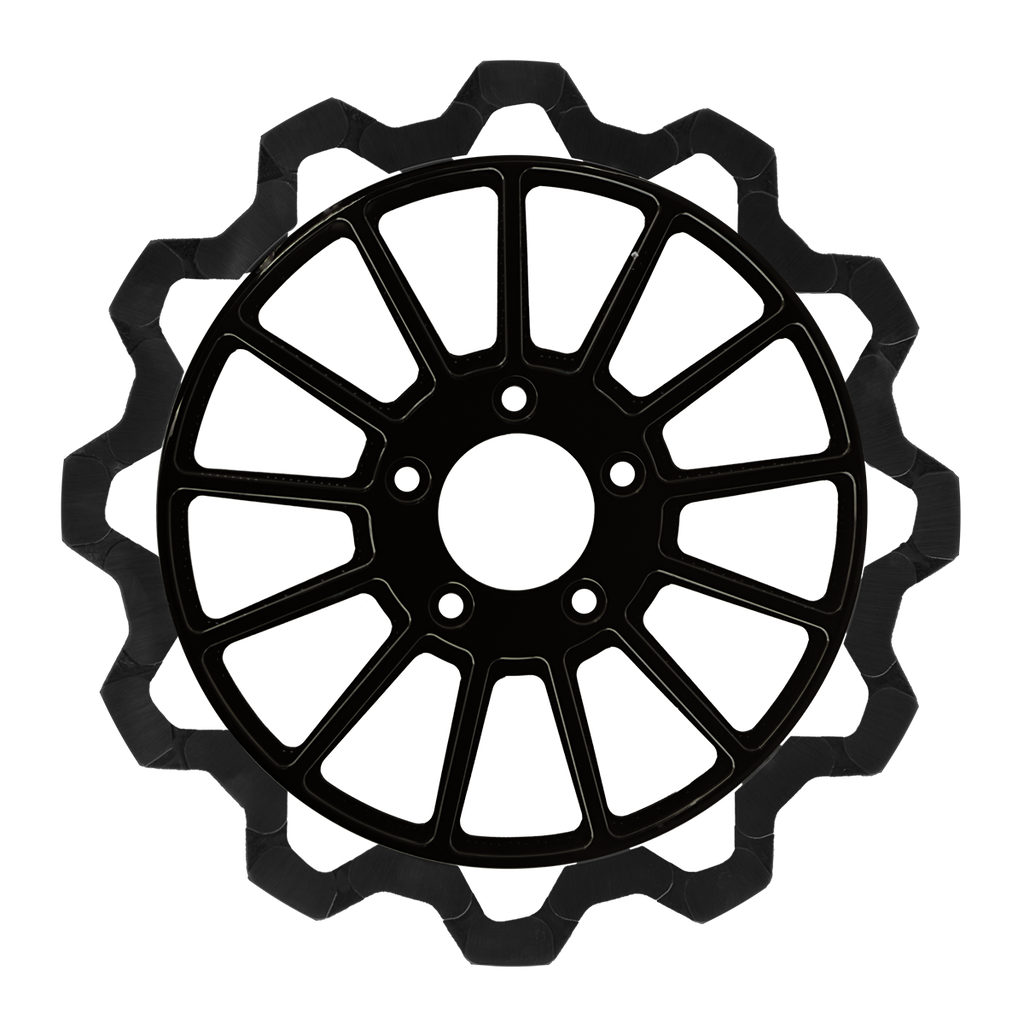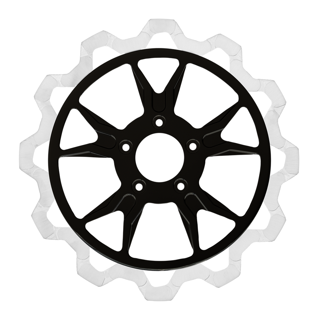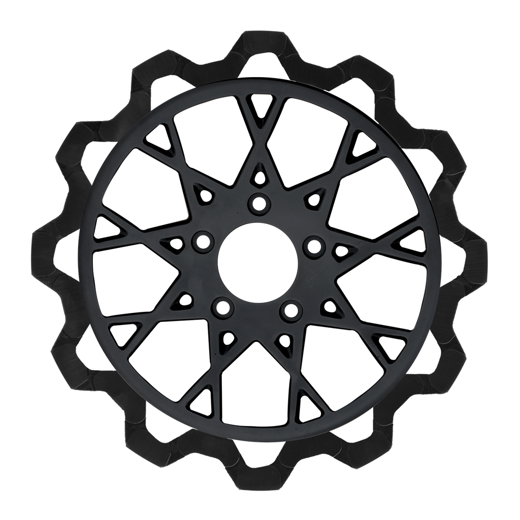 The reduced weight of Lyndall Crown cut rotors enhances rider control by minimizing rotating mass, while the incorporated gas slots effectively outgas debris and gasses generated during friction, preserving the rotor's integrity against brake pad wear and aiding in cooling.