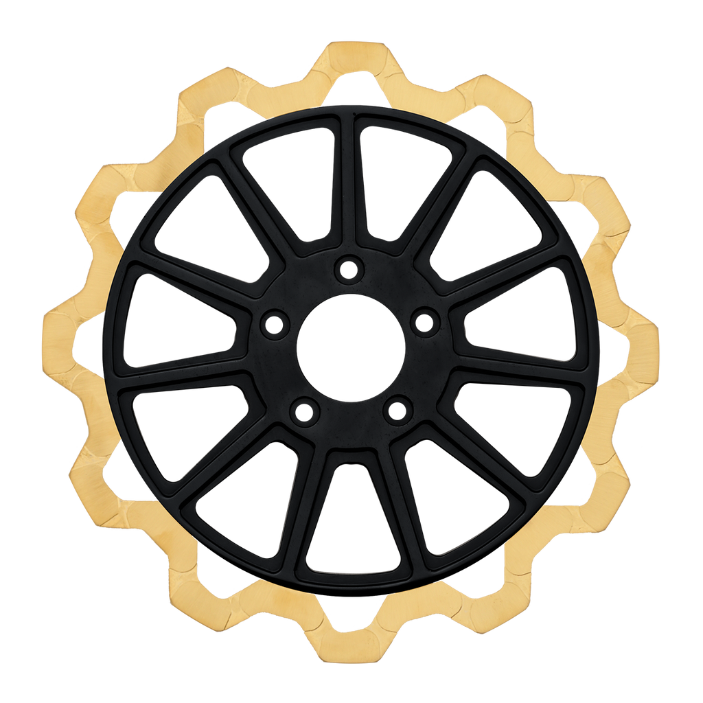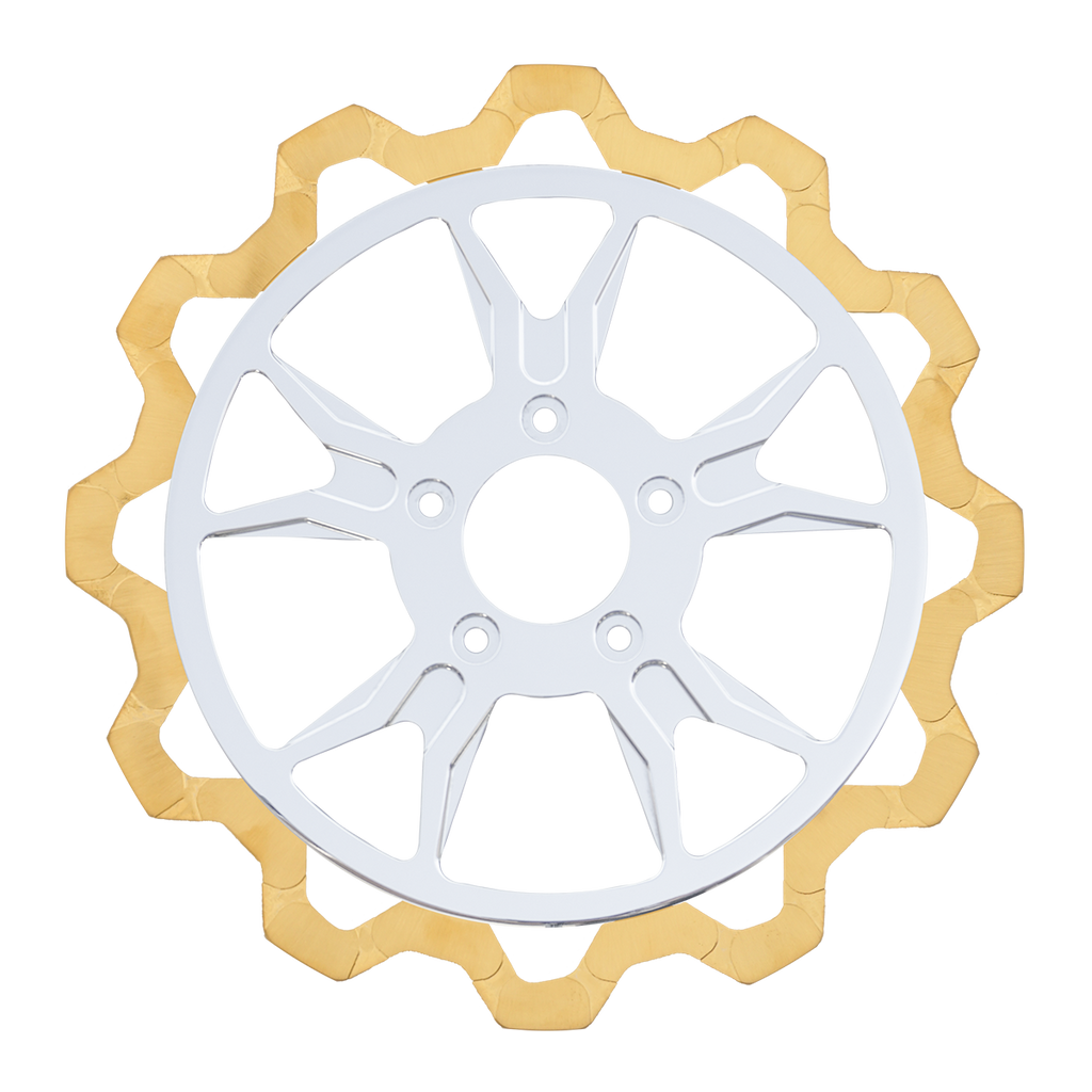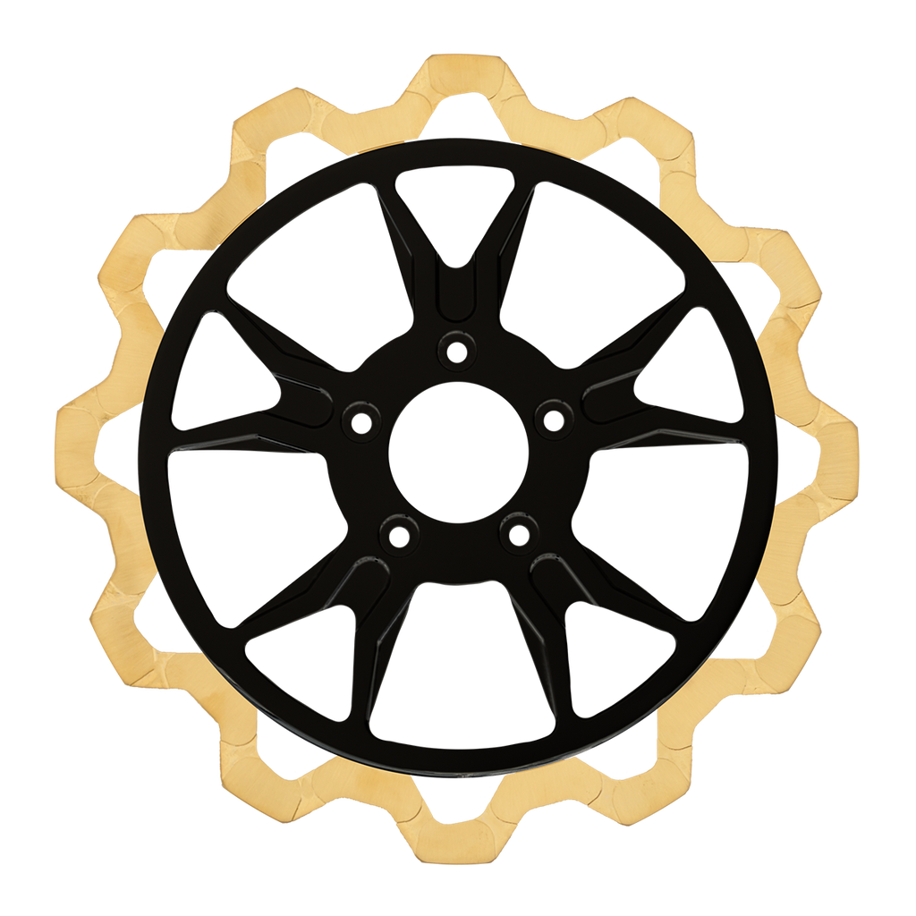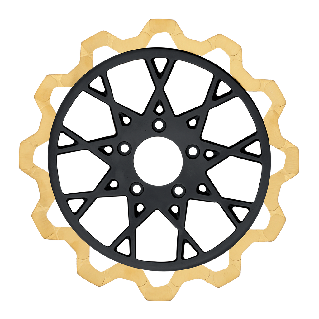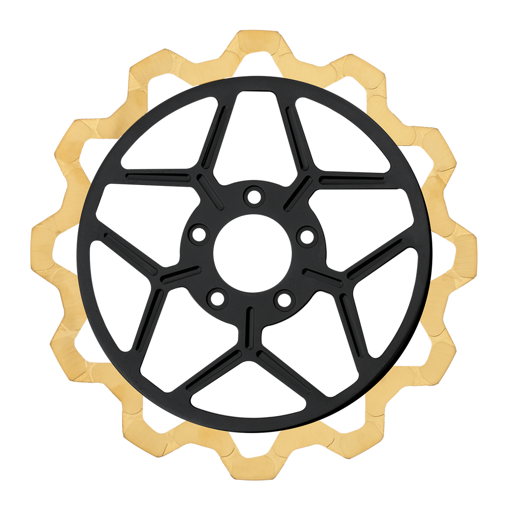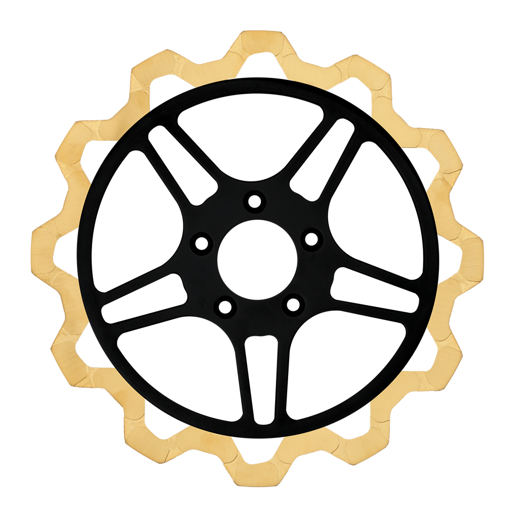 For riders who prioritize both performance and aesthetics, our Gold+ brake compound is the ideal choice. Designed to prioritize braking effectiveness, this compound removes the finish from areas that engage the brake pads, while still delivering exceptional friction rating. This pad leaves a nice contrast look of machine finish and the original gold or black color in the gas slots of the rotor.