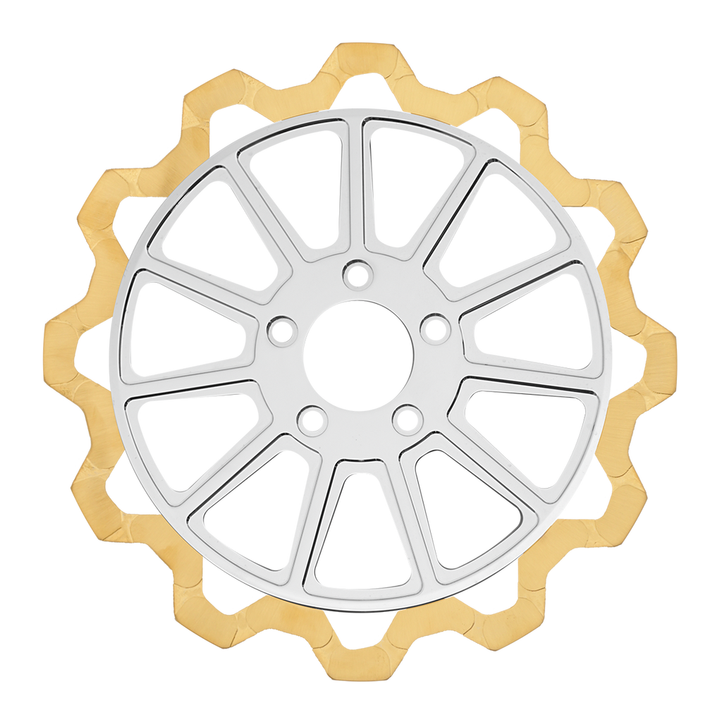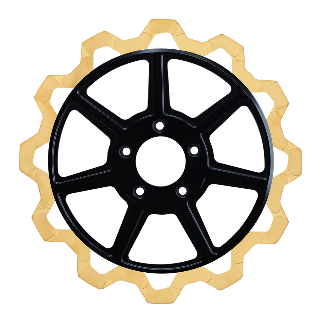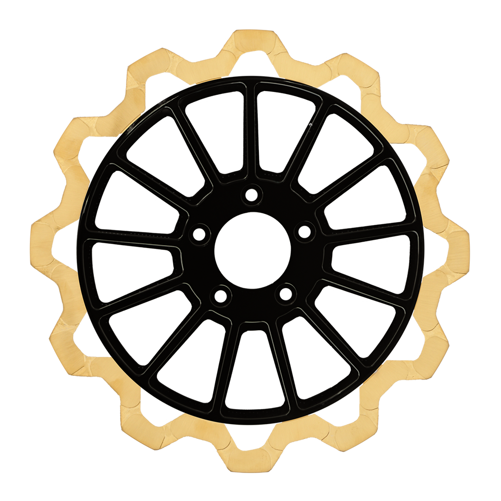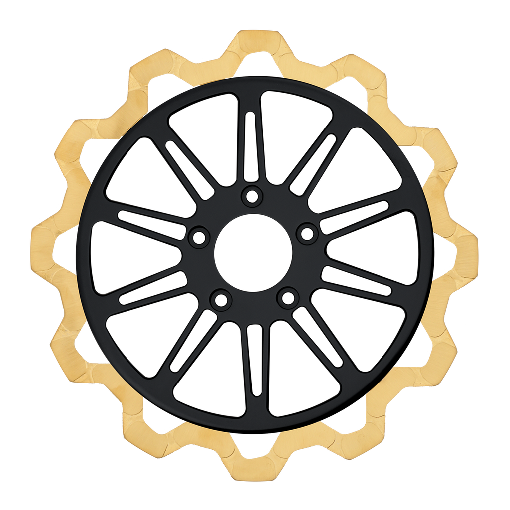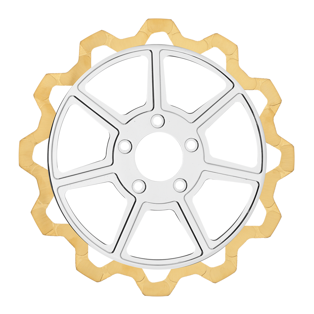 For riders who prioritize both performance and aesthetics, our Gold+ brake compound is the ideal choice. Designed to prioritize braking effectiveness, this compound removes the finish from areas that engage the brake pads, while still delivering exceptional friction rating. This pad leaves a nice contrast look of machine finish and the original gold or black color in the gas slots of the rotor.