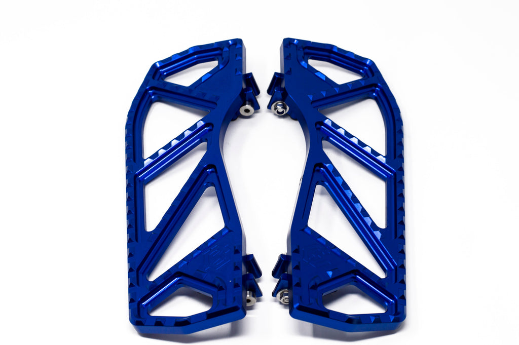 We are super excited to introduce our new Bagger MX Floorboards. These bad boys are made from 6061 T6 alloy aluminum by CNC machining. These materials are up to 50% Lighter than most stock floorboards. Color anodizing surface treatment helps improve the corrosion resistance and gives a badass custom look. The comfortable serrated foot surface area gives you a wider area for your feet and provide a good bite on the bottom of your shoe. All fastener are made from stainless steel for wear-resisting and resisting corrosion. Our Floorboards measure in at 12 x 4.5 inch giving you a large area for optimum comfort.