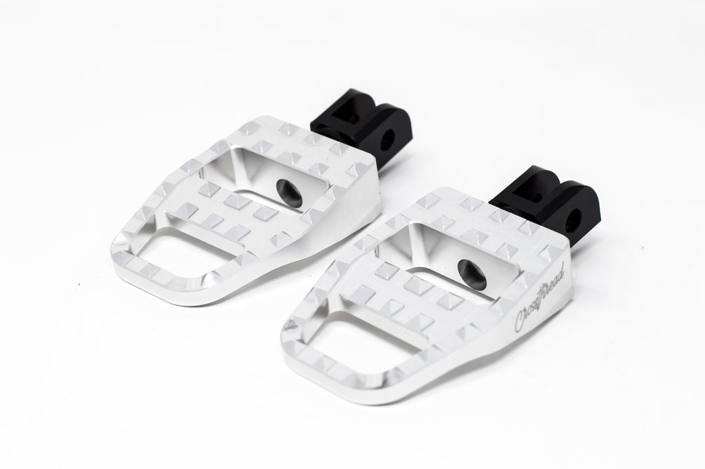 Looking for some grippy Pegs but don't want the spikes? Then these are the Pegs for you. Our MX Pegs are made from 6061 T6 alloy aluminum by CNC machining. These materials are up to 50% Lighter than most stock foot pegs. Color anodizing surface treatment helps improve the corrosion resistance and gives a badass custom look. Full 360 degree foot peg rotation makes these foot pegs perfect for whatever riding style you prefer. All fastener are made form stainless steel for wear-resisting and resisting corrosion. Our Pegs surface measures in at roughly 2.5'' x 3.75''