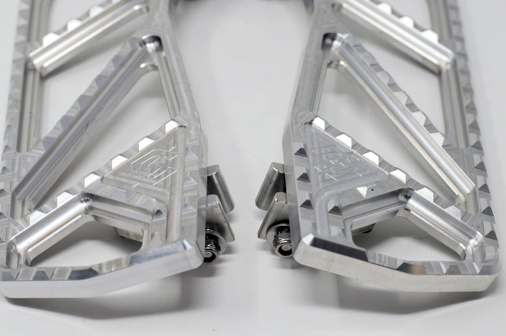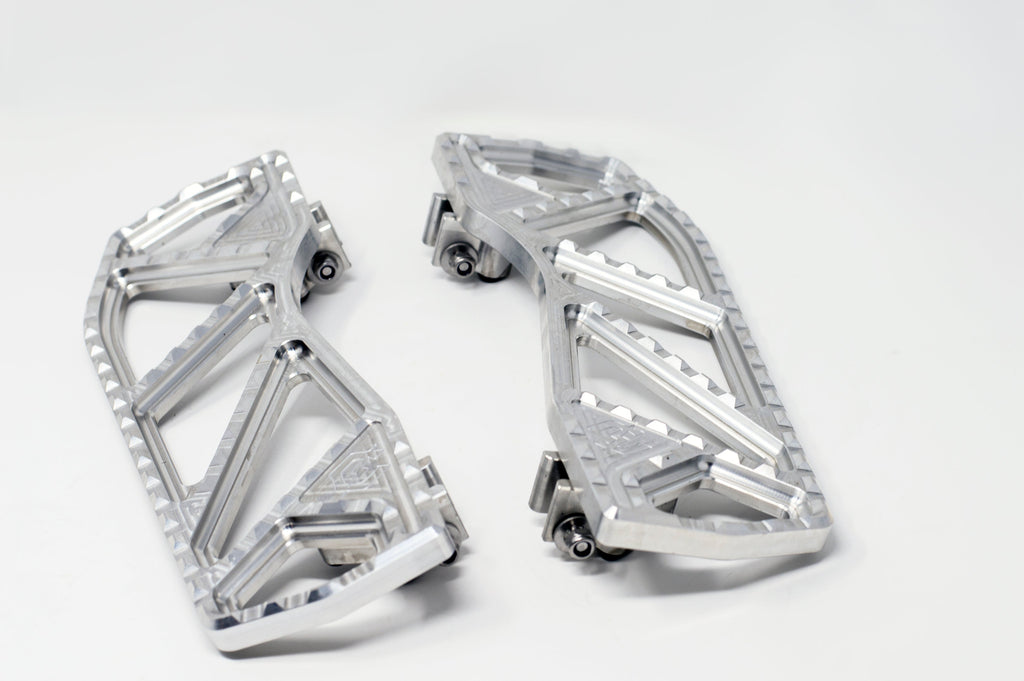 We are super excited to introduce our new Bagger MX Floorboards. These bad boys are made from 6061 T6 alloy aluminum by CNC machining. These materials are up to 50% Lighter than most stock floorboards. Color anodizing surface treatment helps improve the corrosion resistance and gives a badass custom look. The comfortable serrated foot surface area gives you a wider area for your feet and provide a good bite on the bottom of your shoe. All fastener are made from stainless steel for wear-resisting and resisting corrosion. Our Floorboards measure in at 12 x 4.5 inch giving you a large area for optimum comfort.