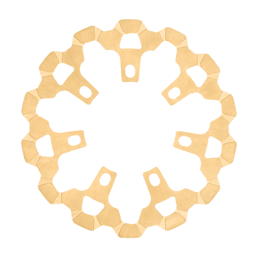 Lyndall Bow-Tie cut rotors are our newest design. These are similar to the Crown Cut design, but with significantly less weight and better outgassing. Our Bow-Tie cut friction rings are also designed to provide better stopping power. By reducing the surface area where the brake pads make contact with the friction ring, clamping power per square inch is increased.