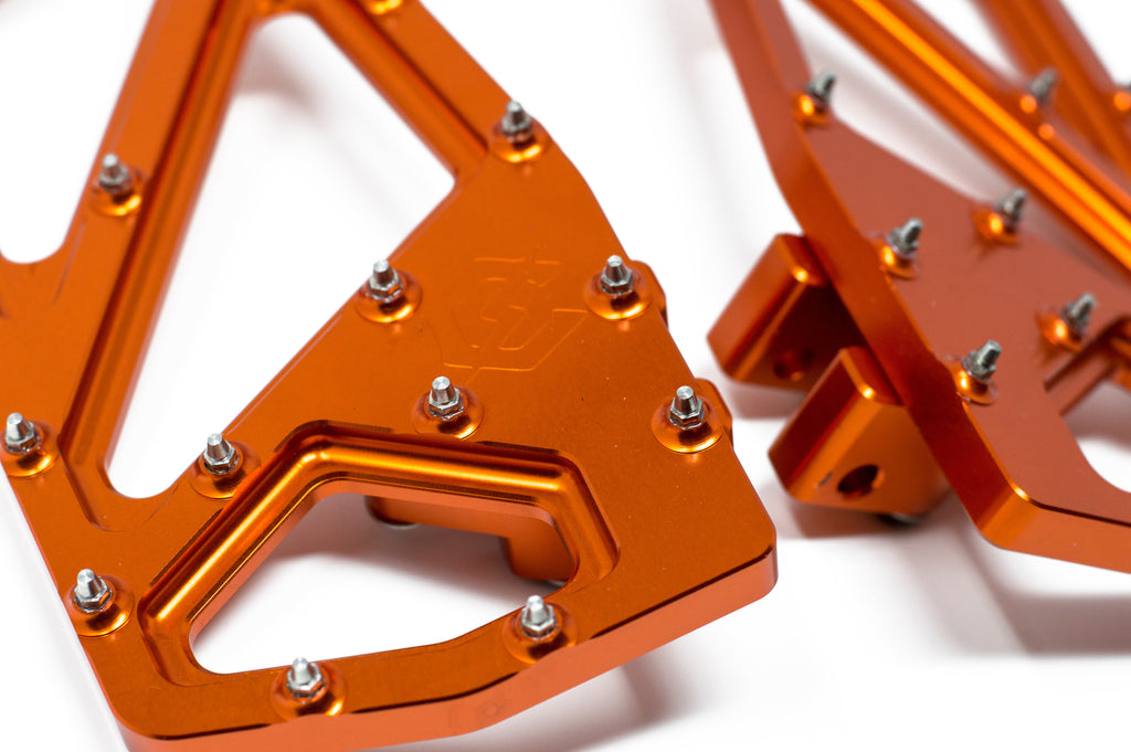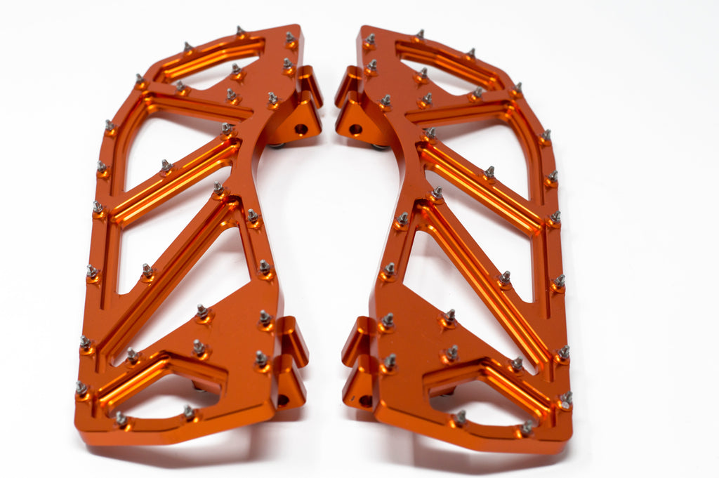 We are super excited to introduce our new Bagger MX Floorboards. These bad boys are made from 6061 T6 alloy aluminum by CNC machining. These materials are up to 50% Lighter than most stock floorboards. Color anodizing surface treatment helps improve the corrosion resistance and gives a badass custom look. The comfortable serrated foot surface area gives you a wider area for your feet and provide a good bite on the bottom of your shoe. All fastener are made from stainless steel for wear-resisting and resisting corrosion. Our Floorboards measure in at 12 x 4.5 inch giving you a large area for optimum comfort.